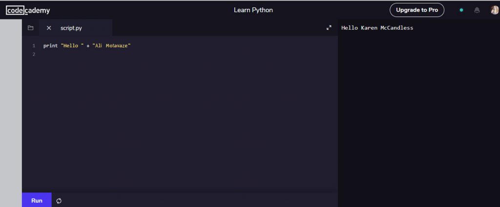 تصویر زیر، نمونهای از کدهای ابتدایی Python را نشان میدهد که به کامپیوتر میگوید، عبارتهای hello و Ali Motavaze را نمایش دهد.